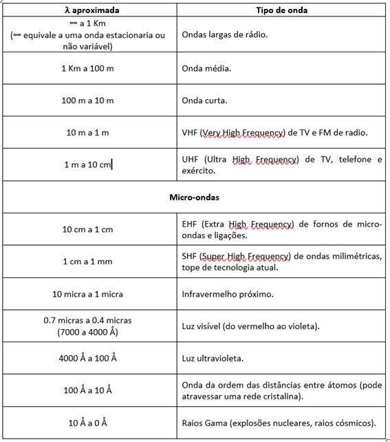 Espectro eletromagnético em relação aos comprimentos de onda: